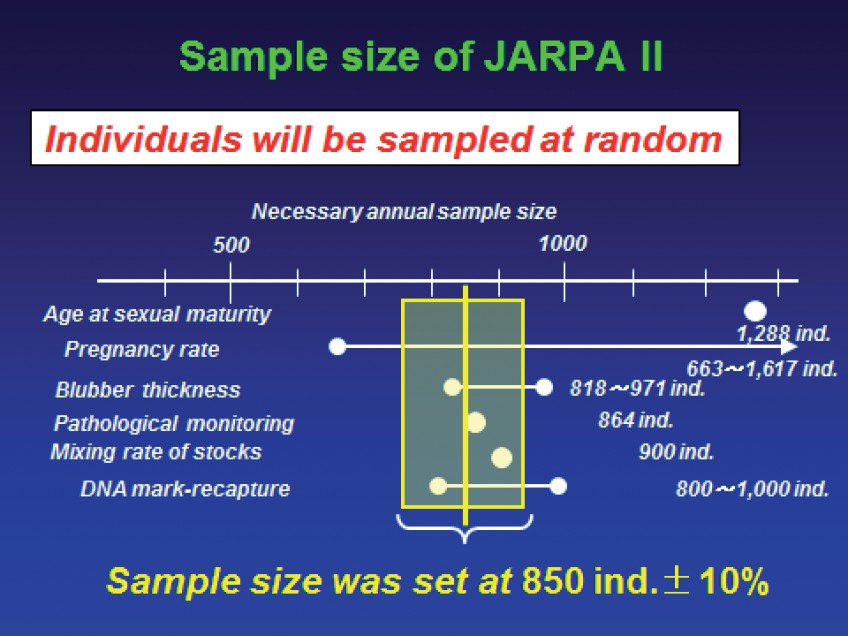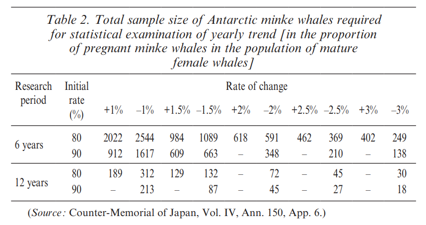 195. The Court thus identifies two overarching concerns with regard to the minke whale sample size. First, Figure 5-4 shows that the final sample size of 850 minke whales (plus or minus 10 per cent) falls within a range derived from the individual sample sizes for various research items, but there is a lack of transparency regarding the decisions made in selecting those individual sample sizes. The Court notes that a lack of transparency in the JARPA II Research Plan and in Japan’s subsequent efforts to defend the JARPA II sample size do not necessarily demonstrate that the decisions made with regard to particular research items lack scientific justification. In the context of Article VIII, however, the evidence regarding the selection of a minimum sample size should allow one to understand why that sample size is reasonable in relation to achieving the programme’s objectives, when compared with other possible sample sizes that would require killing far fewer whales. The absence of such evidence in connection with most of the sample size calculations described in the JARPA II Research Plan lends support to Australia’s contention that a predetermined overall sample size has dictated the choice of the research period and the rate of change to be detected, rather than the other way around.
